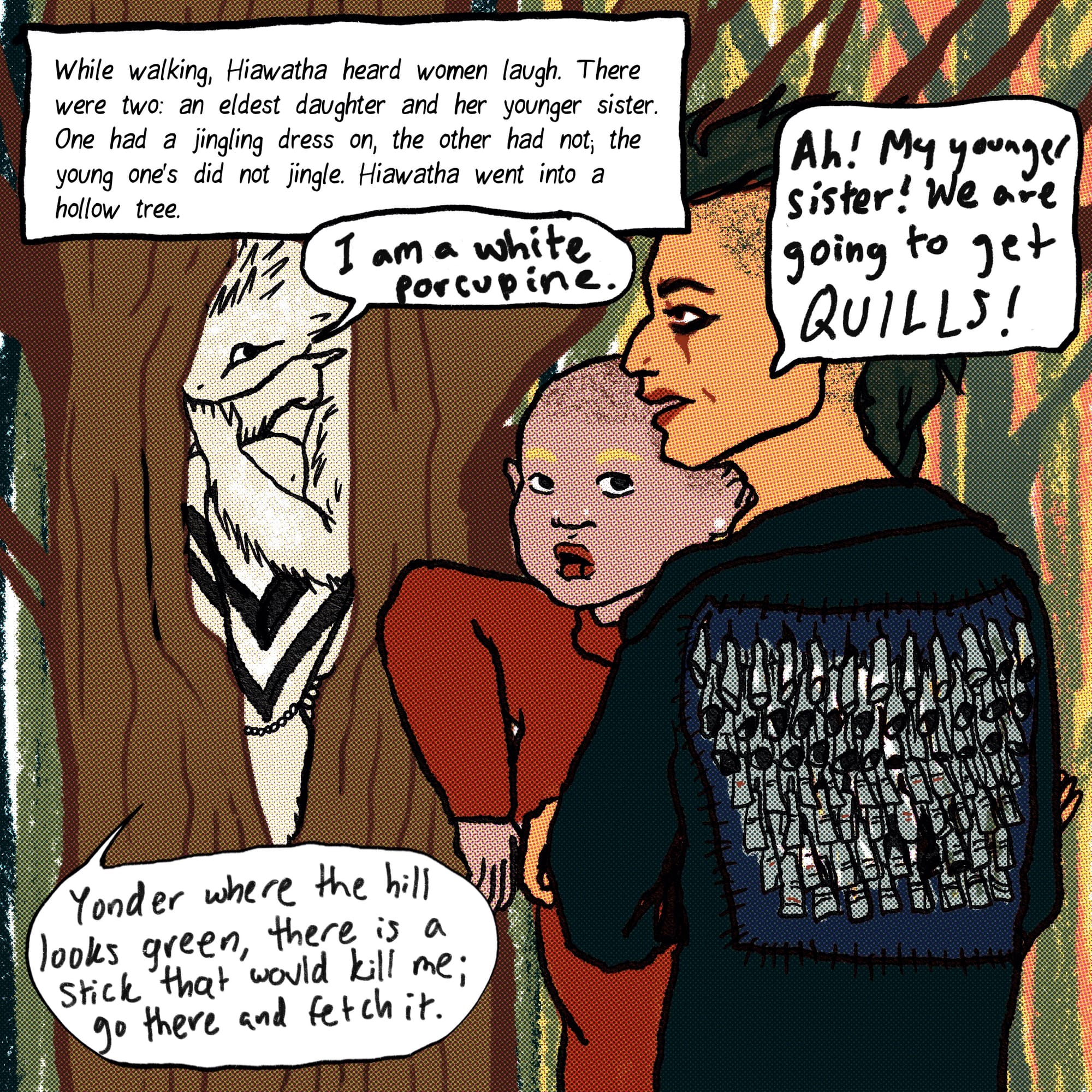 Trickster in the shape of a white porcupine with human feet and traditional Anishinaabe tattoos curls up in the hollow of a tree. He addresses two sisters in Anishinaabemowin. The older sister has a mohawk and a battle jacket with jingles on the back panel. The younger sister has a buzzcut and a red turtleneck dress on, with bleached brows and vampire piercings.
