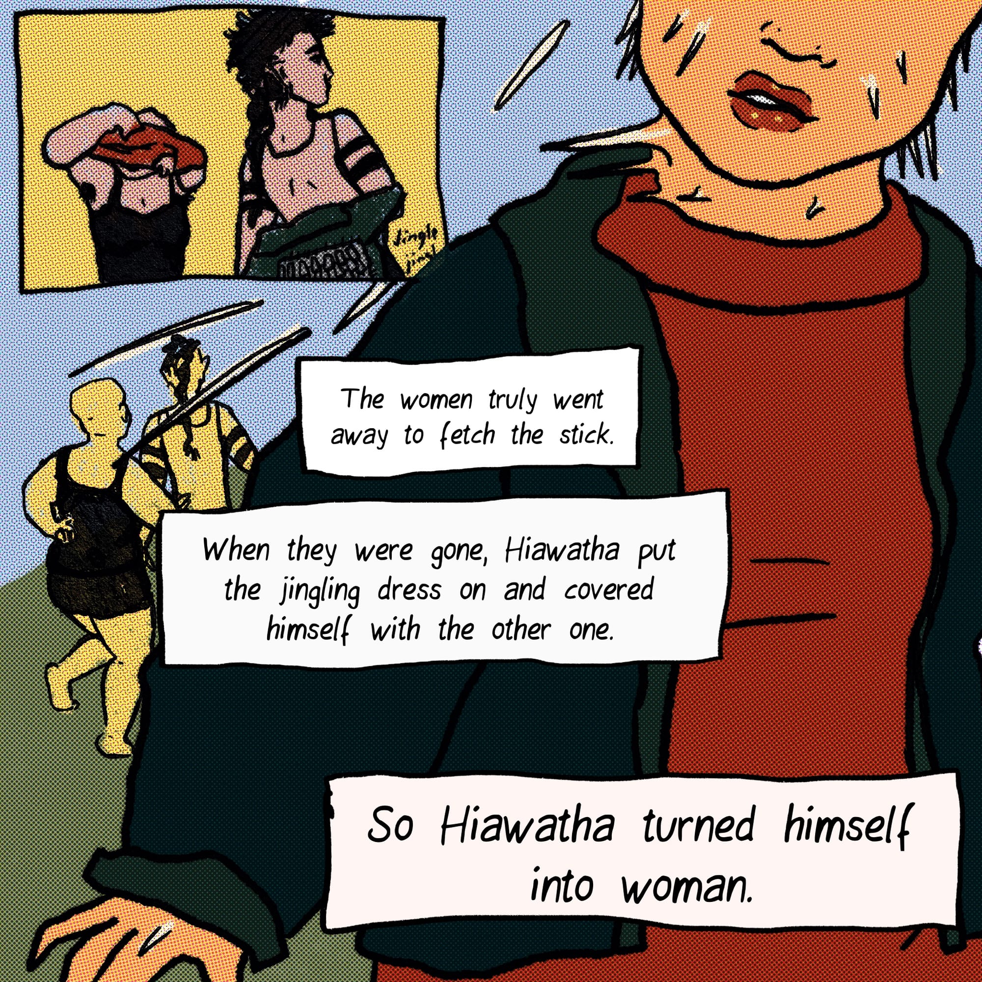 This is an English-language version of Berdache, a comic by Shaawan Francis Keahna and Waabanokiizhick Mandosking. Read the Anishinaabemowin version of this comic here. You can view a transcript with image descriptions of the comic in English at the bottom of this page.