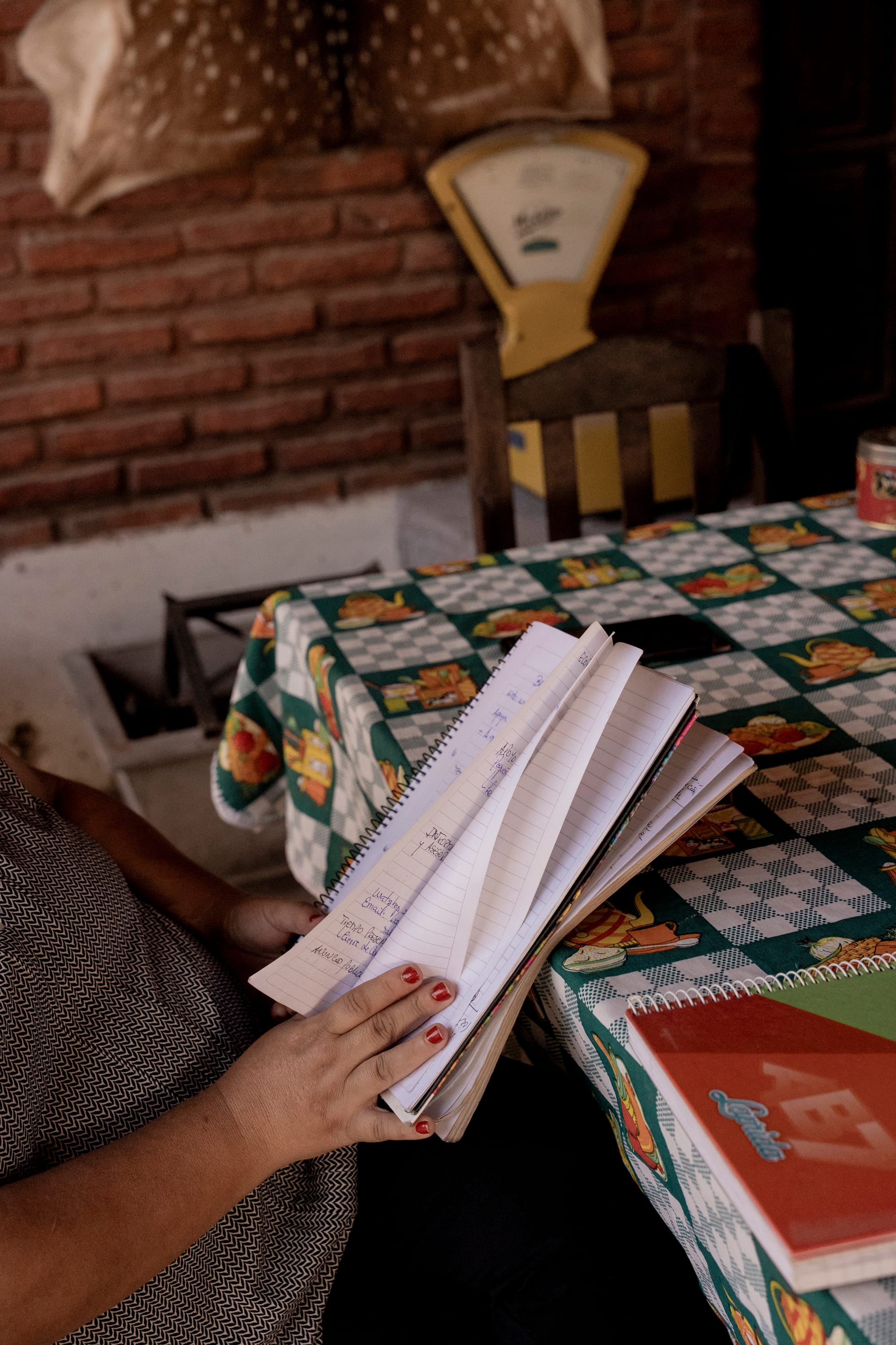 L: Mireya Gutierrez holds her notebook full of ideas and projects for her community at her farm on December 16, 2024, in Ifran, Goya, Province of Corrientes, Argentina. R: Cinthia Coria operating the mixing board during a broadcast of the radio program “Sapucai” on La Chicharra station on December 17, 2024, in Goya, Corrientes Province, Argentina. Photos by Anita Pouchard Serra with the support of the Pulitzer Center.